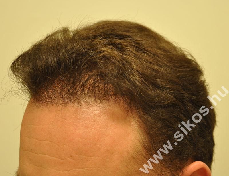 Homloki hajhiány pótlása 2 hajbeültetés hajátültetés műtéttel, először FUT csíkvételi műtéttel 2185 grafttal, utána sűrítés FUE hajvételi technikával nyert 1327 grafttal.